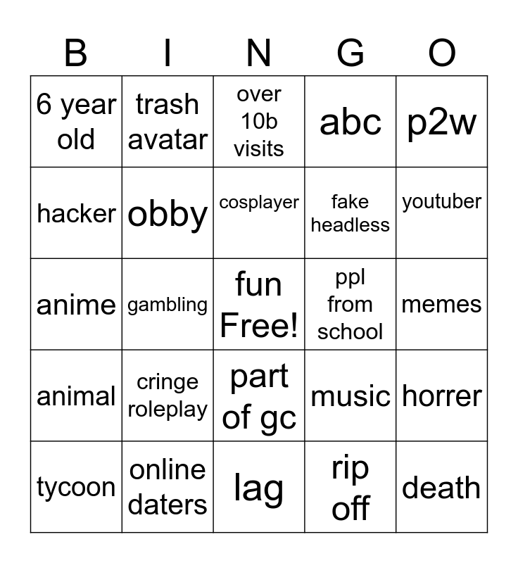 This bingo card has a free space and 24 words: cringe roleplay, online daters, cosplayer, tycoon, p2w, 6 year old, hacker, trash avatar, ppl from school, part of gc, fake headless, anime, music, horrer, obby, rip off, memes, over 10b visits, youtuber, gambling, death, animal, abc and lag.
