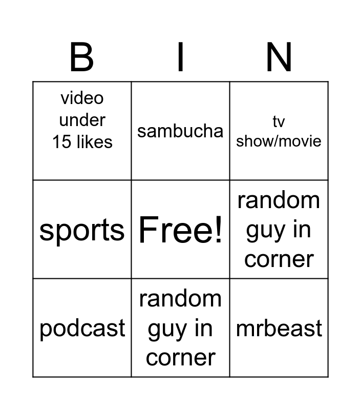 This bingo card has a free space and 9 words: podcast, tv show/movie, sambucha, sports, video under 15 likes, random guy in corner, mrbeast, food and random guy in corner.