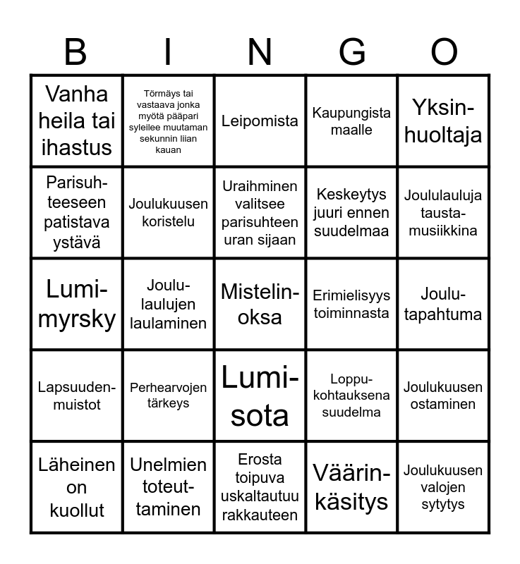 This bingo card has 25 words: Perhearvojen tärkeys, Erosta toipuva uskaltautuu rakkauteen, Uraihminen valitsee parisuhteen uran sijaan, Läheinen on kuollut, Yksin-huoltaja, Vanha heila tai ihastus, Parisuh-teeseen patistava ystävä, Törmäys tai vastaava jonka myötä pääpari syleilee muutaman sekunnin liian kauan, Erimielisyys toiminnasta, Lumi-sota, Keskeytys juuri ennen suudelmaa, Lumi-myrsky, Loppu-kohtauksena suudelma, Joulukuusen ostaminen, Joulukuusen koristelu, Joulukuusen valojen sytytys, Joulu-tapahtuma, Leipomista, Joululauluja tausta-musiikkina, Joulu-laulujen laulaminen, Mistelin-oksa, Unelmien toteut-taminen, Lapsuuden-muistot, Kaupungista maalle and Väärin-käsitys.