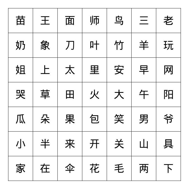 This bingo card has 49 words: 山, 羊, 毛, 草, 太, 阳, 王, 伞, 三, 包, 老, 师, 早, 安, 半, 午, 奶, 玩, 具, 鸟, 竹, 田, 苗, 象, 家, 刀, 网, 在, 里, 上, 下, 大, 小, 来, 哭, 笑, 男, 爷, 姐, 果, 开, 瓜, 火, 花, 叶, 面, 关, 朵 and 两.