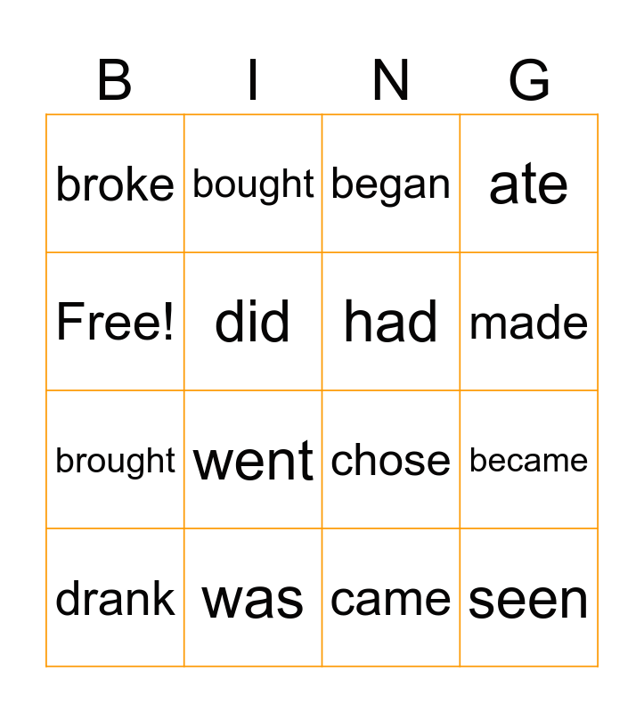 This bingo card has 16 words: was, became, began, broke, brought, bought, chose, came, Free!, did, drank, ate, went, made, had and seen.