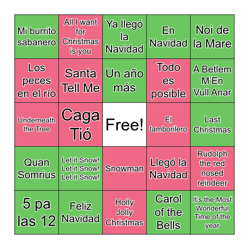 This bingo card has a free space and 28 words: Rudolph the red nosed reindeer, Fum Fum Fum 25 de desembre, Todo es posible, Carol of the Bells, Los peces en el río, Ya llegó la Navidad, All I want for Christmas is you, Quan Somrius, El tamborilero, 5 pa las 12, Underneath the Tree, En Navidad, Feliz Navidad, Holly Jolly Christmas, A Betlem M’En Vull Anar, Jingle Bell Rock, Let it Snow! Let it Snow! Let it Snow!, Santa Tell Me, Un año más, Snowman, Mi burrito sabanero, Avui És Nadal, It’s the Most Wonderful Time of the year, Caga Tió, Last Christmas, Llegó la Navidad, Noi de la Mare and Rocking around the Christmas tree.