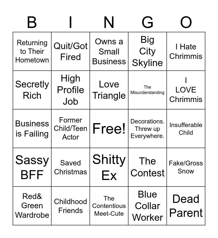 This bingo card has a free space and 24 words: Saved Christmas, Childhood Friends, Love Triangle, Red& Green Wardrobe, I Hate Chrimmis, Returning to Their Hometown, Secretly Rich, Quit/Got Fired, Decorations. Threw up Everywhere., Shitty Ex, The Misunderstanding, Business is Failing, The Contest, Fake/Gross Snow, High Profile Job, Blue Collar Worker, Insufferable Child, Owns a Small Business, I LOVE Chrimmis, Former Child/Teen Actor, Dead Parent, Sassy BFF, Big City Skyline and The Contentious Meet-Cute.