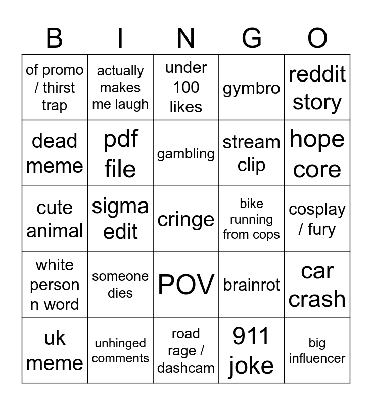 This bingo card has a free space and 24 words: someone dies, unhinged comments, gambling, uk meme, reddit story, of promo / thirst trap, dead meme, actually makes me laugh, bike running from cops, POV, stream clip, cute animal, brainrot, car crash, pdf file, 911 joke, cosplay / fury, under 100 likes, hope core, sigma edit, big influencer, white person n word, gymbro and road rage / dashcam.
