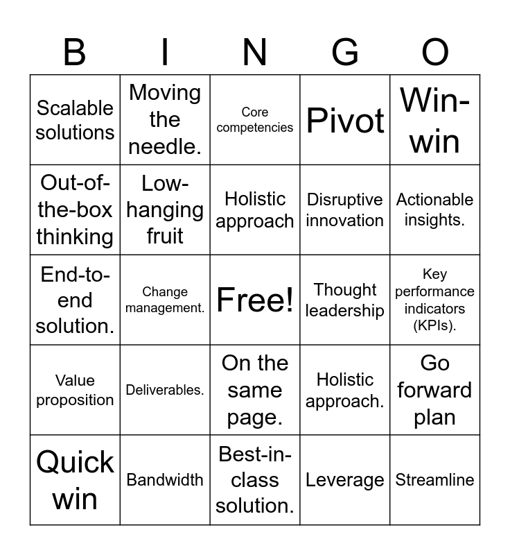 This bingo card has a free space and 61 words: Synergy, Bandwidth, Deep dive, Value proposition, Leverage, Paradigm shift, Low-hanging fruit, Circle back, Disruptive innovation, On the same page, Pivot, Actionable insights, Out-of-the-box thinking, Best practices, Touch base, Scalable solutions, Streamline, Win-win, ROI (Return on Investment), Holistic approach, Thought leadership, Core competencies, Quick win, Go forward plan, Blue sky thinking, Let's circle back., At the end of the day..., We're leveraging best practices., Actionable insights., Synergy between teams., Aligning stakeholders., Deep dive into the data., Driving value., Paradigm shift., Moving the needle., Out-of-the-box thinking., Scalable solution., Change management., Stakeholder engagement., End-to-end solution., Touch base offline., Deliverables., Key performance indicators (KPIs)., Value proposition., Holistic approach., Agile methodology., Win-win situation., Pain points., Quick win., On the same page., Best-in-class solution., Moving forward., Above & Beyond, Tangible outcomes., Scalable growth., Mindshare., Pain-point resolution., Action plan., Change agent., net-net and Siloed departments..