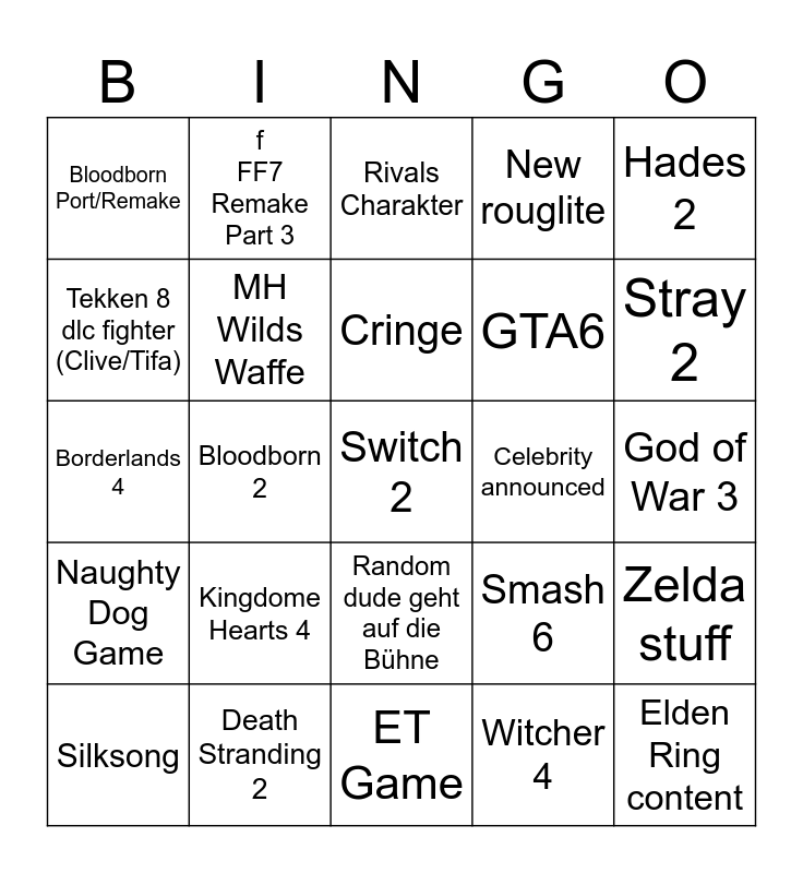 This bingo card has a free space and 24 words: Kingdome Hearts 4, Death Stranding 2, Cringe, Silksong, Hades 2, Bloodborn Port/Remake, Tekken 8 dlc fighter (Clive/Tifa), f FF7 Remake Part 3, Celebrity announced, Random dude geht auf die Bühne, GTA6, Borderlands 4, Smash 6, Zelda stuff, MH Wilds Waffe, Witcher 4, God of War 3, Rivals Charakter, Stray 2, Bloodborn 2, Elden Ring content, Naughty Dog Game, New rouglite and ET Game.