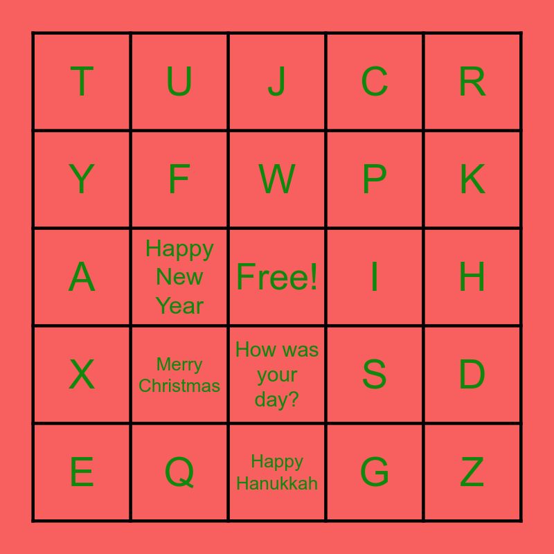 This bingo card has a free space and 24 words: Merry Christmas, Q, W, E, R, T, Y, U, I, How was your day?, P, A, S, D, F, G, H, J, K, Happy New Year, Z, X, C and Happy Hanukkah.