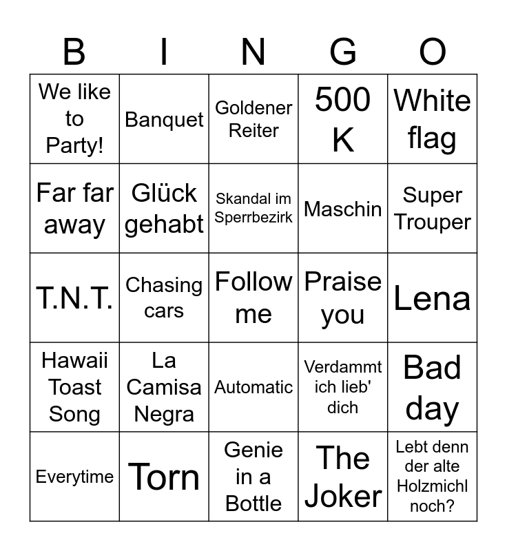 This bingo card has 57 words: Free!, Everytime, Home, We like to Party!, Genie in a Bottle, My Immortal, Glück gehabt, Don't know why, Maschin, Wolke 7, 500 K, Tanz der Moleküle, Mensch, Freedom!, Allein Allein, I'm like a bird, White flag, Chasing cars, I'm outta love, Follow me, Praise you, Alles aus Liebe, Verdammt ich lieb' dich, Goldener Reiter, You can't hurry love, Skandal im Sperrbezirk, König von Deutschland, Bruttosozialprodukt, Super Trouper, Vom selben Stern, Around the World, Les Champs-Elysées, Candy Shop, Boom, Boom, Boom, Boom!!, Lena, Far far away, I couldn't care less, T.N.T., U + ur hand, Hawaii Toast Song, Banquet, Automatic, Lebt denn der alte Holzmichl noch?, Circus, BIER, Fickt-Euch-Allee, La Camisa Negra, Torn, Broken strings, Big big world, Soulmate, The Joker, Shalala lala, Ein Hotdog unten am Hafen, Enjoy the silence, Bad day and Whole again.