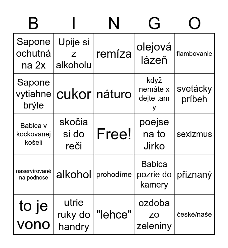 This bingo card has a free space and 24 words: alkohol, utrie ruky do handry, náturo, to je vono, flambovanie, Sapone ochutná na 2x, Sapone vytiahne brýle, Upije si z alkoholu, poejse na to Jirko, prohodíme, když nemáte x dejte tam y, Babica v kockovanej košeli, Babica pozrie do kamery, přiznaný, cukor, ozdoba zo zeleniny, sexizmus, remíza, svetácky príbeh, skočia si do reči, české/naše, naservírované na podnose, olejová lázeň and "lehce".