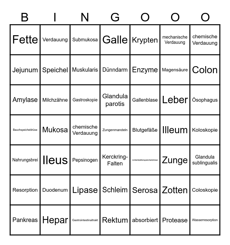 This bingo card has 49 words: Zotten, Magensäure, absorbiert, Mukosa, Gastroskopie, Koloskopie, Verdauung, Gastrointestinaltrakt, mechanische Verdauung, Kerckring-Falten, chemische Verdauung, Galle, Leber, Gallenblase, Duodenum, Illeum, Jejunum, Colon, Coloskopie, Krypten, Enzyme, chemische Verdauung, Fette, Speichel, Pankreas, Muskularis, Ösophagus, Hepar, Glandula parotis, Milchzähne, Wasserresorption, Blutgefäße, Resorption, Lipase, Bauchspeicheldrüse, Unterkieferspeicheldrüse, Zunge, Glandula sublingualis, Amylase, Pepsinogen, Schleim, Nahrungsbrei, Zungenmandeln, Rektum, Dünndarm, Submukosa, Serosa, Ileus and Protease.