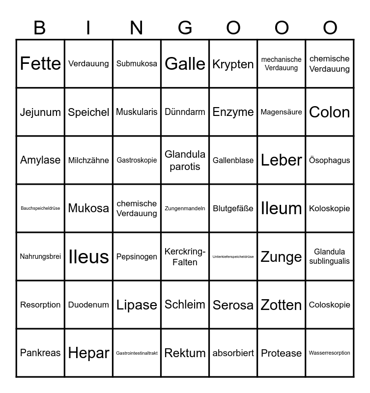 This bingo card has 49 words: Zotten, Magensäure, absorbiert, Mukosa, Gastroskopie, Koloskopie, Verdauung, Gastrointestinaltrakt, mechanische Verdauung, Kerckring-Falten, chemische Verdauung, Galle, Leber, Gallenblase, Duodenum, Ileum, Jejunum, Colon, Coloskopie, Krypten, Enzyme, chemische Verdauung, Fette, Speichel, Pankreas, Muskularis, Ösophagus, Hepar, Glandula parotis, Milchzähne, Wasserresorption, Blutgefäße, Resorption, Lipase, Bauchspeicheldrüse, Unterkieferspeicheldrüse, Zunge, Glandula sublingualis, Amylase, Pepsinogen, Schleim, Nahrungsbrei, Zungenmandeln, Rektum, Dünndarm, Submukosa, Serosa, Ileus and Protease.