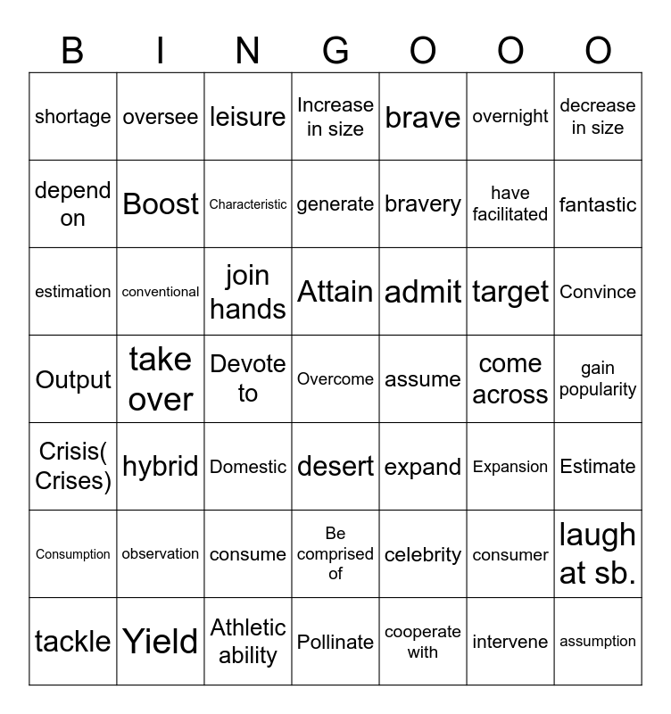 This bingo card has 49 words: consumer, have facilitated, cooperate with, take over, join hands, gain popularity, oversee, Athletic ability, overnight, desert, decrease in size, Increase in size, target, admit, observation, come across, depend on, fantastic, laugh at sb., brave, bravery, Devote to, shortage, Boost, tackle, Characteristic, Convince, Yield, Attain, conventional, assumption, assume, Consumption, consume, Output, expand, Expansion, Estimate, estimation, Domestic, Be comprised of, Crisis( Crises), Overcome, Pollinate, generate, leisure, celebrity, hybrid and intervene.