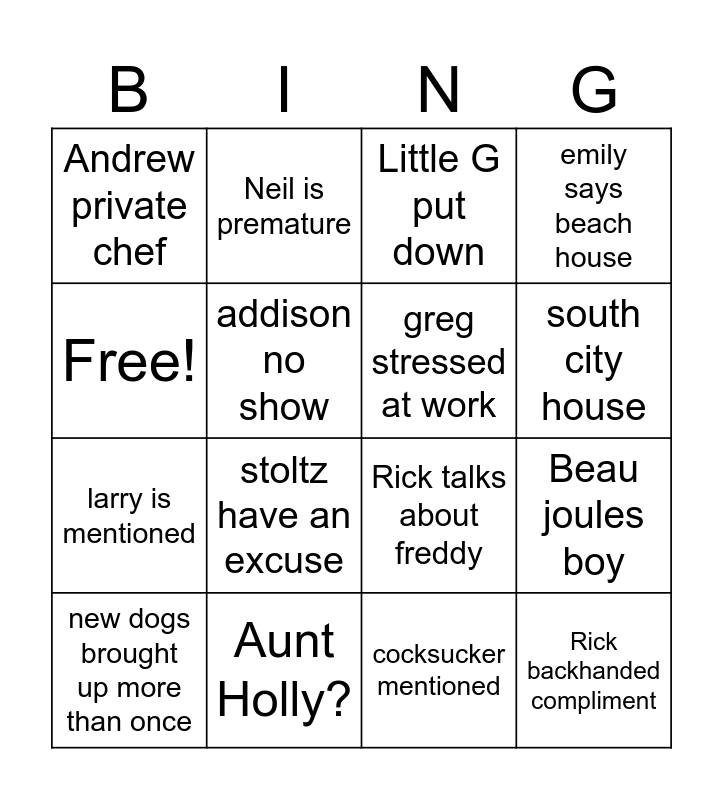 This bingo card has 16 words: Aunt Holly?, Beau joules boy, Little G put down, Andrew private chef, larry is mentioned, Neil is premature, Rick talks about freddy, cocksucker mentioned, Free!, addison no show, new dogs brought up more than once, emily says beach house, stoltz have an excuse, south city house, greg stressed at work and Rick backhanded compliment.