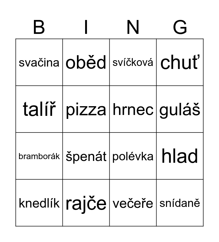 This bingo card has 16 words: rajče, hlad, svíčková, svačina, bramborák, oběd, polévka, večeře, talíř, pizza, knedlík, chuť, špenát, guláš, hrnec and snídaně.