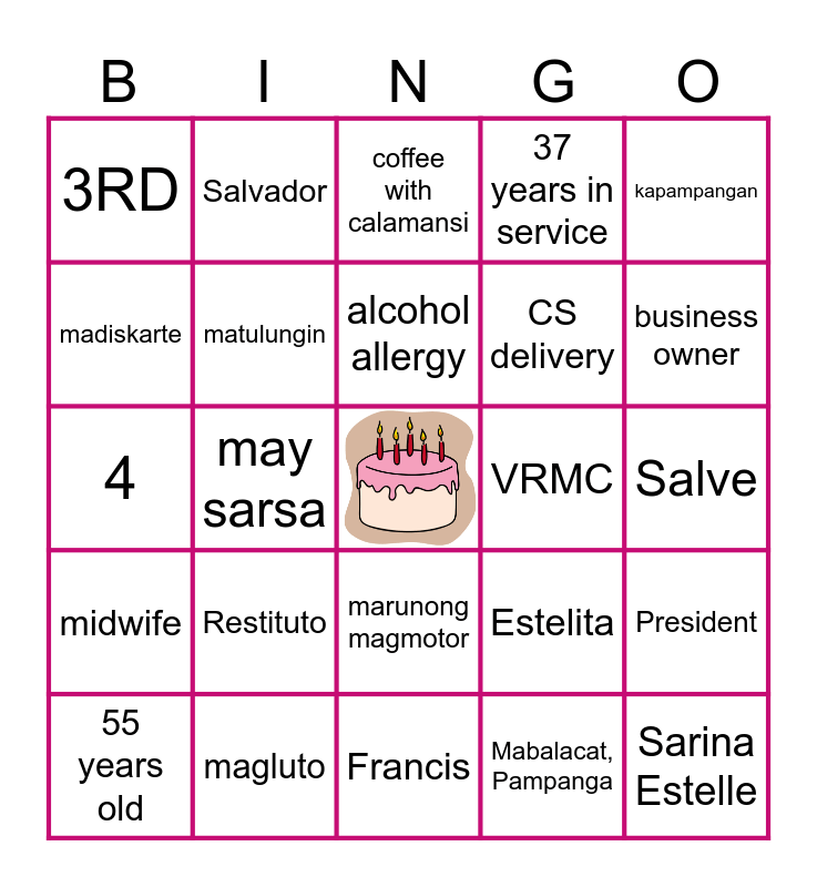 This bingo card has a free space and 24 words: 55 years old, Restituto, alcohol allergy, Mabalacat, Pampanga, kapampangan, 3RD, Salvador, coffee with calamansi, VRMC, Salve, 4, matulungin, Estelita, President, madiskarte, magluto, Francis, 37 years in service, business owner, midwife, may sarsa, marunong magmotor, CS delivery and Sarina Estelle.
