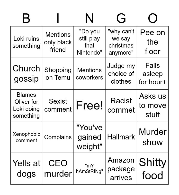 This bingo card has a free space and 24 words: Complains, CEO murder, Mentions coworkers, Yells at dogs, Pee on the floor, Loki ruins something, Church gossip, Mentions only black friend, Racist commet, "You've gained weight", Judge my choice of clothes, Blames Oliver for Loki doing something, Hallmark, Murder show, Shopping on Temu, Amazon package arrives, Asks us to move stuff, "Do you still play that Nintendo", Falls asleep for hour+, Sexist comment, Shitty food, Xenophobic comment, "why can't we say christmas anymore" and "mY hAmStRINg".