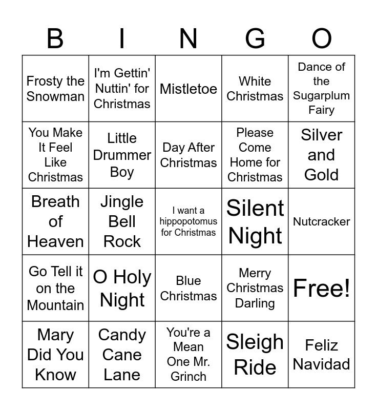 This bingo card has 50 words: I Saw Mommy Kissing Santa Claus, I want a hippopotomus for Christmas, Hark the Herald Angels Sing, You're a Mean One Mr. Grinch, O Holy Night, Up On The House Top, I'm Gettin' Nuttin' for Christmas, Rockin' Around the Christmas Tree, You Make It Feel Like Christmas, Happy Christmas (War is Over), Little Drummer Boy, White Christmas, Free!, Merry Christmas Darling, A Marshmallow World, The Heart of Chistmas, Day After Christmas, Silent Night, Hallelujah, Dance of the Sugarplum Fairy, Jingle Bell Rock, Sleigh Ride, Frosty the Snowman, Please Come Home for Christmas, Carol of the Bells, Feliz Navidad, Silver and Gold, Grandma Got Ran Over by a Reindeer, Mistletoe, Blue Christmas, Do You Want to Build a Snowman, Joy to the World, The Chipmunk Song, Silver Bells, Candy Cane Lane, It's Beginning to Look a Lot Like Christmas, O Tannenbaum, Run Rudolph Run, Mary's Boy Child, Nutcracker, The Christmas Can-Can, Who Spiked the Eggnog, Let it Snow, Jesus is Born Today, Mary Did You Know, Breath of Heaven, Let it be Christmas, Away in a Manger, Go Tell it on the Mountain and Jingle Bells.
