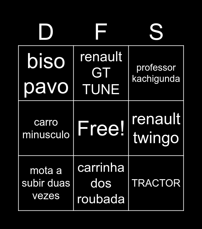 This bingo card has a free space and 8 words: renault twingo, professor kachigunda, renault GT TUNE, mota a subir duas vezes, biso pavo, TRACTOR, carro minusculo and carrinha dos roubada.