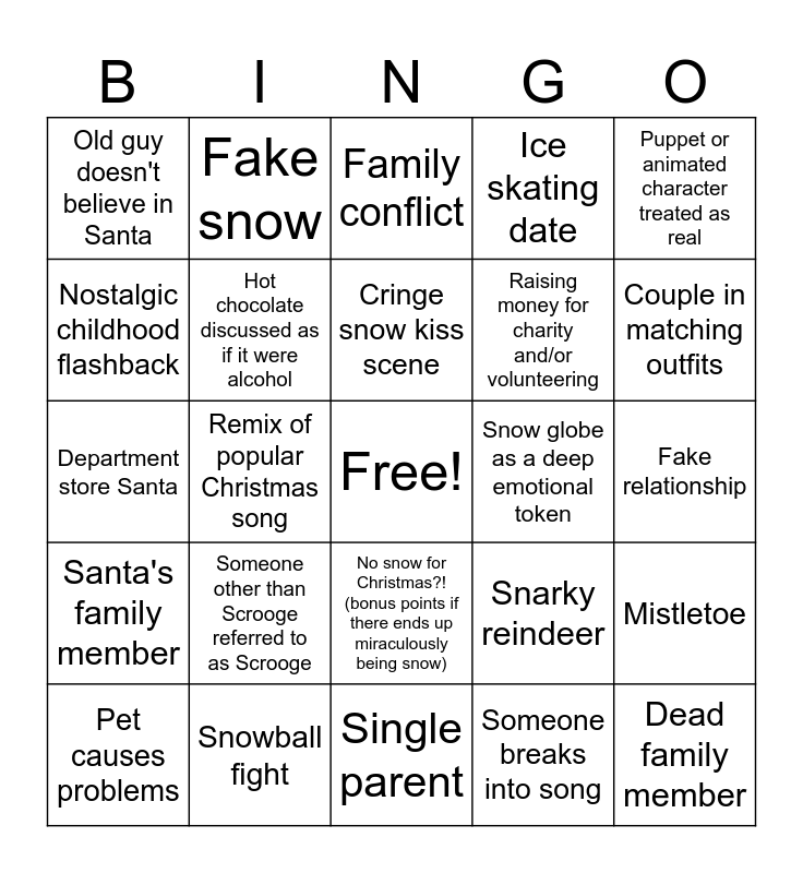 This bingo card has a free space and 36 words: Crashing into the roof, Falling down the chimney, Make cookies for Santa, Hot chocolate discussed as if it were alcohol, Snarky reindeer, Santa's family member, Cringe snow kiss scene, Someone unexpectedly home for the holidays, Puppet or animated character treated as real, Santa or elf costume worn in public, Remix of popular Christmas song, Ice skating date, Christmas tree or string light mishap, Snow globe as a deep emotional token, Couple in matching outfits, Old guy doesn't believe in Santa, "Santa's in trouble!" or "Christmas is ruined!", Someone other than Scrooge referred to as Scrooge, Dead family member, Family conflict, Fake relationship, Mistletoe, Snowball fight, Pet causes problems, Single parent, Fake snow, Department store Santa, Snowstorm, Raising money for charity and/or volunteering, Nostalgic childhood flashback, Deep advice from a kid, "That's what Christmas is about!", Someone breaks into song, No snow for Christmas?! (bonus points if there ends up miraculously being snow), Breaking and entering from someone other than Santa and Thinly veiled religious allegory.