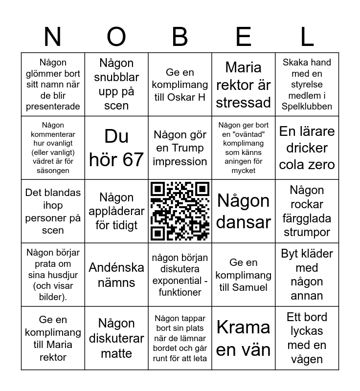 This bingo card has a free space and 51 words: En klänning eller kostym är väldigt glitterfylld, Ett bord lyckas med en vågen, Någon försöker muta en lärare, Någon tappar bort sin plats när de lämnar bordet och går runt för att leta, Andénska nämns, Någon spiller dricka, Någon snubblar upp på scen, Olle har mustasch, Någon kommenterar hur ovanligt (eller vanligt) vädret är för säsongen, Du lär dig 5 nya namn, Du hör 67, Maria rektor är stressad, Byt kläder med någon annan, Ge en komplimang till Samuel, Byt sitts med en elev från en annan årskurs för resten av nobelfesten, Någon börjar prata politik, Någon gör en Trump impression, Någon dansar, Någon klagar på maten, Skaka hand med en styrelse medlem i Spelklubben, Någon applåderar för tidigt, Krama en vän, Någon glömmer bort sitt namn när de blir presenterade, Någon ger bort en "oväntad" komplimang som känns aningen för mycket, Ge en genuin komplimang till någon, Lär dig 3 saker om en person du inte känner sedan tidigare, En lärare dricker cola zero, En lärare dricker julmust, Ge en komplimang till Maria rektor, Ge en komplimang till Oskar H, Ge en komplimang till Louise, Ge en komplimang till Elin, Någon dyker upp i jultröja, Någon har på sig fluga, Fråga Oskar G hur det går i diplomacy, Någon diskuterar matte, Någon har på sig slips, Du hör någon säga "Det där är riggat!", En telefon ringer mitt under ett tal., Någon ställer en fråga som får alla att tystna., Någon rockar färgglada strumpor, Någon börjar prata om sina husdjur (och visar bilder)., Någon ställer en dum fråga, Någon kommer inte uppklädd, Prata med en elev i en annan årskurs, Tekniken strular på scen, Det blandas ihop personer på scen, Ett glas går sönder, någon behöver en penna, någon början diskutera exponential -funktioner and Skriv något fint till 0768339767.