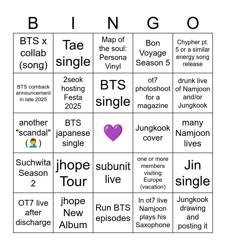 This bingo card has a free space and 24 words: jhope Tour, jhope New Album, BTS single, OT7 live after discharge, Chypher pt. 5 or a similar energy song release, BTS x collab (song), BTS comback announcement in late 2025, Tae single, Jungkook cover, subunit live, ot7 photoshoot for a magazine, another "scandal" (🤦♂️), one or more members visiting Europe (vacation), Jin single, 2seok hosting Festa 2025, In ot7 live Namjoon plays his Saxophone, many Namjoon lives, Map of the soul: Persona Vinyl, drunk live of Namjoon and/or Jungkook, BTS japanese single, Jungkook drawing and posting it, Suchwita Season 2, Bon Voyage Season 5 and Run BTS episodes.