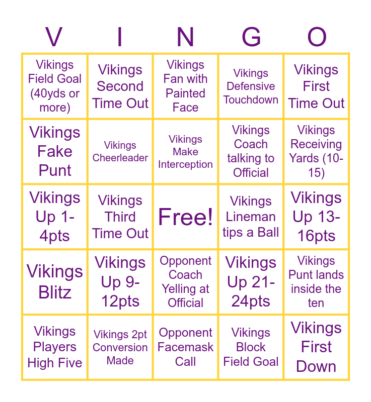This bingo card has a free space and 61 words: Vikings 1pt Conversion Made, Vikings 2pt Conversion Made, Vikings 4th Down attempt Made, Vikings Blitz, Vikings Block Field Goal, Vikings Challenge Won, Vikings Cheerleader, Vikings Coach Challenge, Vikings Coach talking to Official, Vikings Dance/Formation Made, Vikings Defensive Touchdown, Vikings Fair Catch, Vikings Fake Punt, Vikings Field Goal (20-30yds), Vikings Field Goal (30-40yds), Vikings Field Goal (40yds or more), Vikings First Down, Vikings First Time Out, Vikings Hail Mary, Vikings Make Interception, Vikings Lineman tips a Ball, Vikings Fan with Painted Face, Vikings Players High Five, Vikings Punt lands inside the ten, Vikings Punt Return (10-15), Vikings Punt Return (15+), Vikings QB Sneak, Vikings QB Takes a Knee, Vikings Receiving Yards (10-15), Vikings Receiving Yards (15-20), Vikings Receiving Yards (20+), Vikings Rush Yards (5-10), Vikings Sack, Vikings Safety, Vikings Second Time Out, Vikings Stopped 4th Down, The Jeffersons TV Theme, Vikings Third Time Out, Vikings Touchdown Run, Vikings Up 1-4pts, Vikings Up 4-8pts, Vikings Up 9-12pts, Vikings Up 13-16pts, Vikings Up 17-20pts, Vikings Up 21-24pts, Vikings Up 25+ pts, Opponent Team Challenge Lost, Opponent Team Delay of Game, Opponent Coach Yelling, Opponent Coach Yelling at Official, Opponent Facemask Call, Opponent False Start, Opponent Failed 4th Down Attempt, Opponent Fumble, Opponent Hold, Opponent Missed 2pt Attempt, Opponent Missed Field Goal, Opponent Off Side, Opponent Pass Interference, Opponent Player Throws Helmet and Opponent Unsportsmanlike Conduct Flag.
