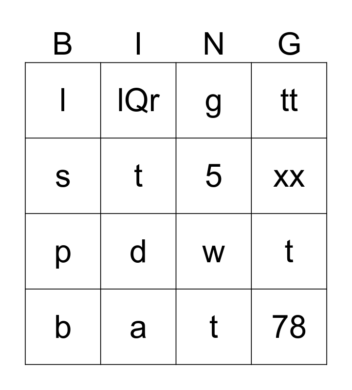 This bingo card has 16 words: a, t, g, l, p, lQr, w, t, s, t, b, tt, d, xx, 5 and 78.