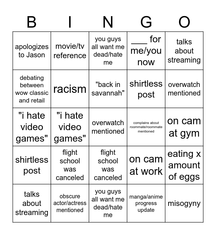 This bingo card has 50 words: misogyny, overwatch mentioned, marvel rivals mentioned, you guys all want me dead/hate me, flight school was canceled, "splinter faction", movie/tv reference, off topic question that adds nothing to current discussion, debating between wow classic and retail, obscure actor/actress mentioned, racism, ___ for me/you now, eating x amount of eggs, on cam at work, on cam at gym, soundboard spam, "back in savannah", complains about roommate/roommate mentioned, in call on the toilet, talks about streaming, "i hate video games", manga/anime progress update, apologizes to Jason, shirtless post, threatens Emma (a dog), misogyny, overwatch mentioned, marvel rivals mentioned, you guys all want me dead/hate me, flight school was canceled, "splinter faction", movie/tv reference, off topic question that adds nothing to current discussion, debating between wow classic and retail, obscure actor/actress mentioned, racism, ___ for me/you now, eating x amount of eggs, on cam at work, on cam at gym, soundboard spam, "back in savannah", complains about roommate/roommate mentioned, in call on the toilet, talks about streaming, "i hate video games", manga/anime progress update, apologizes to Jason, shirtless post and threatens Emma (a dog).