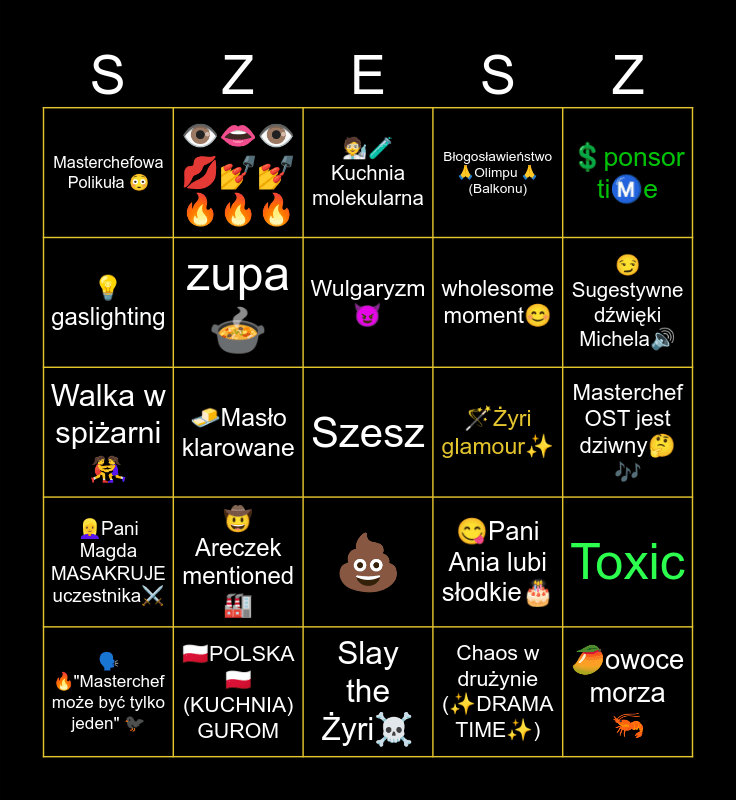 This bingo card has 1 images, a free space and 43 words: ♦️ SIMS poza, 🥭owoce morza 🦐, ODDAJ FARTUCHA 😡, 🗣️🔥"Masterchef może być tylko jeden" 🐦⬛, Żyri to jesteśmy dosłownie my FR FR FR 🫂, Chaos w drużynie (✨DRAMA TIME✨), 🧑🔬🧪Kuchnia molekularna, Piwnica 🐦⬛🗡️👸, 💲ponsor tiⓂ️e, 🇵🇱POLSKA🇵🇱 (KUCHNIA) GUROM, Błogosławieństwo 🙏Olimpu 🙏 (Balkonu), 🪄Żyri glamour✨, 💩, 🤠Areczek mentioned🏭, 💙Blue🥩, Slay the Żyri☠️, 🚨Medical emergency🩹, Walka w spiżarni 🤼♀️, Mystery box 🕋, 😏Sugestywne dźwięki Michela🔊, 👁️👄👁️ 💋💅💅 🔥🔥🔥, Luna jest rozkojarzona i nie ogląda 🙄, 🧑⚕️🧐Eltanin psychoanalizuje, Masterchefowa Polikuła 😳, 😭, Masterchef OST jest dziwny🤔🎶, 😏 Sugestywne ruchy Michela🕺, 😋Pani Ania lubi słodkie🎂, 👱♀️Pani Magda MASAKRUJE uczestnika⚔️, 📸Flashbacki 🧓, Toxic, 🧑🍳📞Wielfuszerka📞🧑🍳, Nie fair😠, 🧈Masło klarowane, Pomocna dłoń 🫳, Mikroplastik 😋, Jak u mamy/babci 👵, Wulgaryzm 😈, 💡gaslighting, wholesome moment😊, 🥬zielona kuchnia, zupa 🍲 and 🏫szkoła🎒.