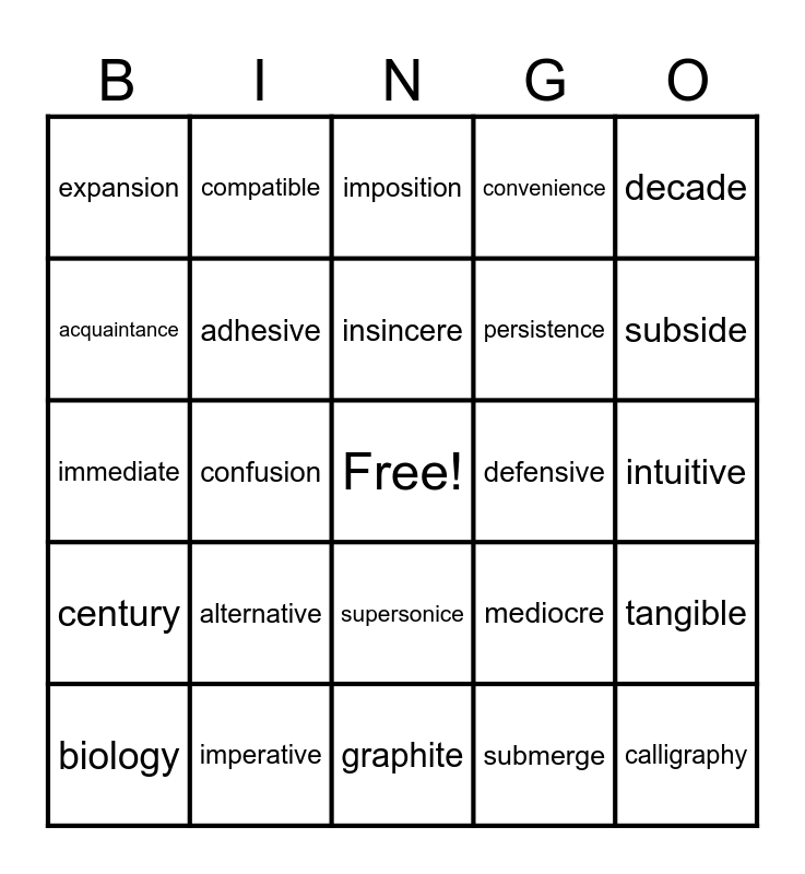 This bingo card has a free space and 29 words: biology, ambition, confusion, correlation, expansion, imposition, adhesive, alternative, defensive, imperative, intuitive, calligraphy, graphite, submerge, subside, superior, supersonice, century, decade, immediate, mediocre, abundance, persistence, acquaintance, convenience, compatible, tangible, insincere and Mrs. Smith.
