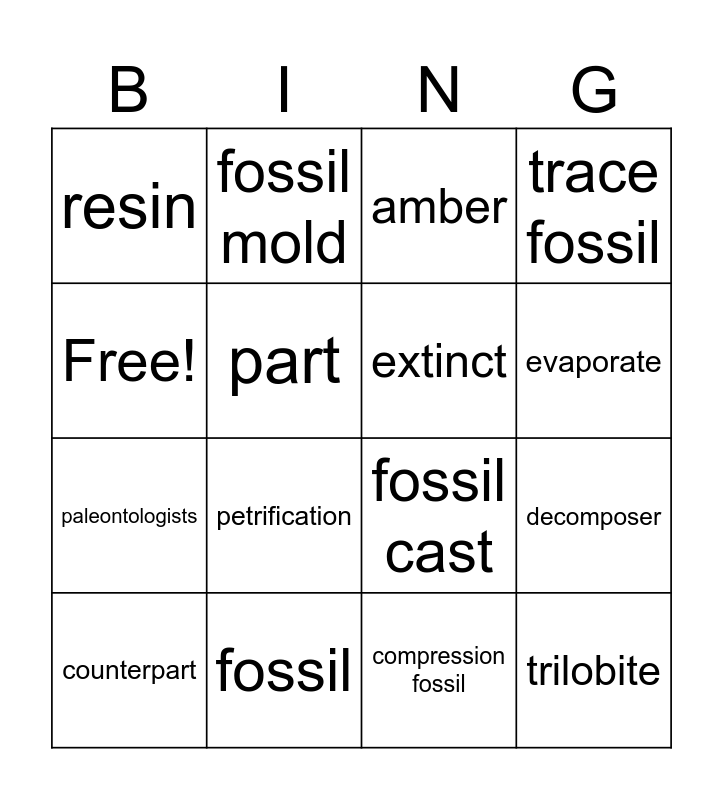 This bingo card has 16 words: fossil, decomposer, amber, resin, paleontologists, fossil mold, fossil cast, compression fossil, Free!, part, counterpart, trace fossil, petrification, evaporate, extinct and trilobite.