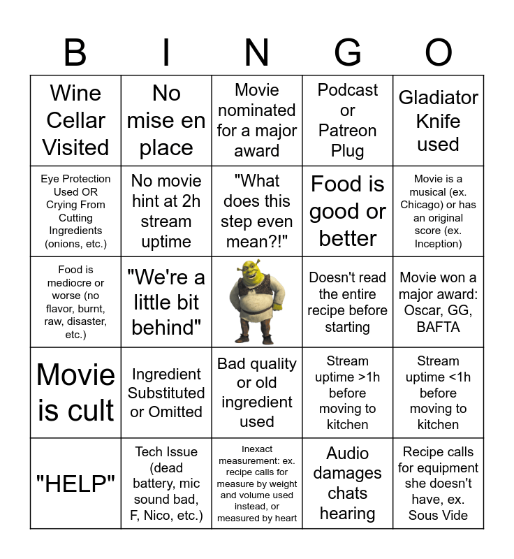 This bingo card has a free space and 24 words: Ingredient Substituted or Omitted, Tech Issue (dead battery, mic sound bad, F, Nico, etc.), "What does this step even mean?!", "HELP", Gladiator Knife used, Wine Cellar Visited, Eye Protection Used OR Crying From Cutting Ingredients (onions, etc.), No mise en place, Doesn't read the entire recipe before starting, Bad quality or old ingredient used, Food is good or better, Food is mediocre or worse (no flavor, burnt, raw, disaster, etc.), Stream uptime >1h before moving to kitchen, Stream uptime <1h before moving to kitchen, No movie hint at 2h stream uptime, Audio damages chats hearing, Movie won a major award: Oscar, GG, BAFTA, Movie nominated for a major award, Movie is a musical (ex. Chicago) or has an original score (ex. Inception), "We're a little bit behind", Recipe calls for equipment she doesn't have, ex. Sous Vide, Movie is cult, Podcast or Patreon Plug and Inexact measurement: ex. recipe calls for measure by weight and volume used instead, or measured by heart.
