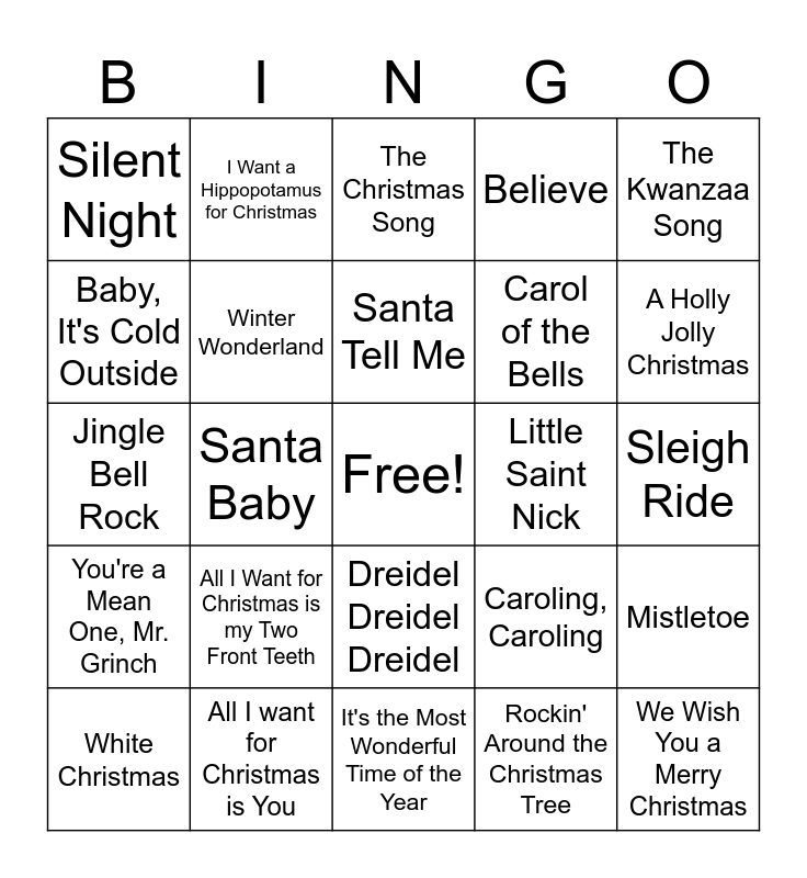This bingo card has a free space and 44 words: Last Christmas, We Wish You a Merry Christmas, Frosty the Snowman, White Christmas, Feliz Navidad, Rockin' Around the Christmas Tree, The Christmas Song, Rudolph the Red Nosed Reindeer, The Kwanzaa Song, All I want for Christmas is You, Believe, Little Saint Nick, Dreidel Dreidel Dreidel, All I Want for Christmas is my Two Front Teeth, Dance of the Sugar Plum Fairy, It's the Most Wonderful Time of the Year, Up on the Housetop, Jingle Bell Rock, Let it Snow! Let it Snow! Let it Snow!, A Holly Jolly Christmas, I Want a Hippopotamus for Christmas, Jingle Bells, Santa Claus is Comin' to Town, Silent Night, What Christmas Means to Me, Sleigh Ride, Run Rudolph Run, Do You Hear What I hear?, Caroling, Caroling, You're a Mean One, Mr. Grinch, It's Beginning to Look a lot like Christmas, Mistletoe, Mele Kalikimaka, Wonderful Christmastime, Santa Baby, Deck the Hall, Here Comes Santa Claus, I Saw Mommy Kissing Santa Claus, Santa Tell Me, Baby, It's Cold Outside, Carol of the Bells, Twelve Days of Christmas, Winter Wonderland and Oh Hanukkah.