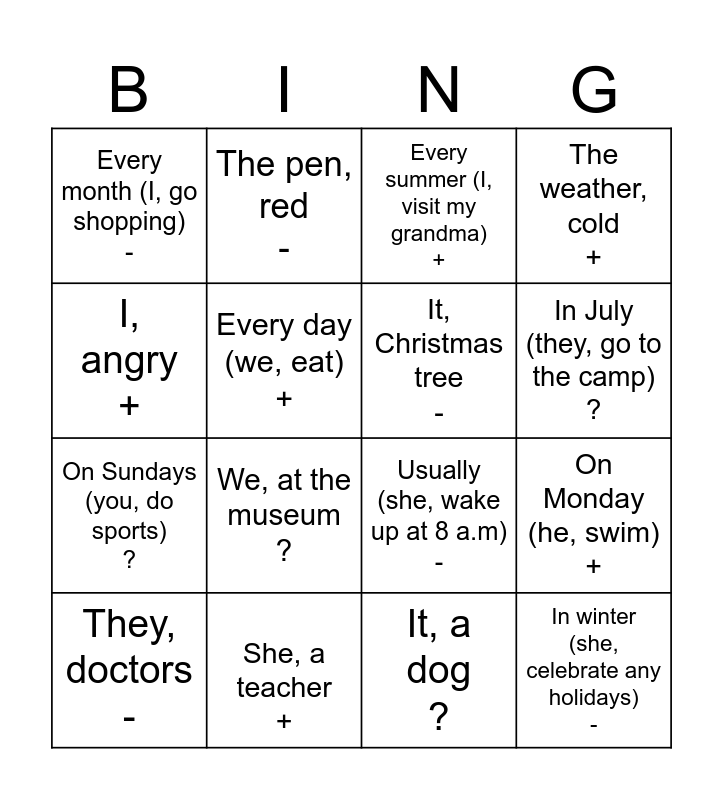This bingo card has 16 words: She, a teacher +, On Monday (he, swim) +, Every summer (I, visit my grandma) +, Every month (I, go shopping) -, On Sundays (you, do sports) ?, The pen, red -, Usually (she, wake up at 8 a.m) -, It, a dog ?, I, angry +, Every day (we, eat) +, They, doctors -, The weather, cold +, We, at the museum ?, In July (they, go to the camp) ?, It, Christmas tree - and In winter (she, celebrate any holidays) -.