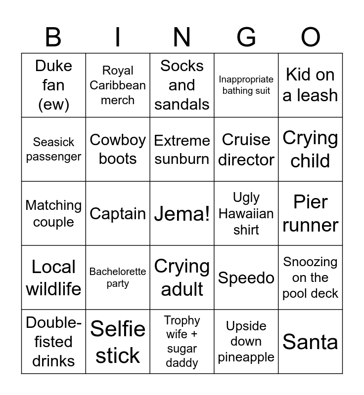 This bingo card has a free space and 24 words: Bachelorette party, Selfie stick, Extreme sunburn, Double-fisted drinks, Kid on a leash, Duke fan (ew), Seasick passenger, Royal Caribbean merch, Ugly Hawaiian shirt, Crying adult, Cruise director, Matching couple, Speedo, Snoozing on the pool deck, Cowboy boots, Upside down pineapple, Pier runner, Socks and sandals, Crying child, Captain, Santa, Local wildlife, Inappropriate bathing suit and Trophy wife + sugar daddy.