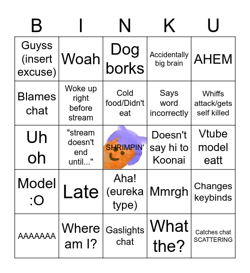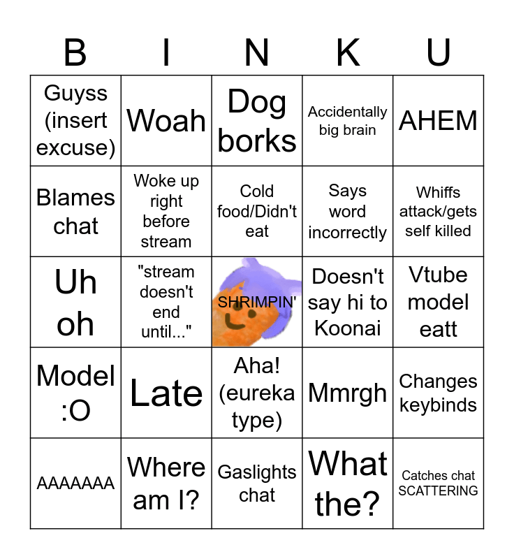 This bingo card has a free space and 24 words: Late, Where am I?, Cold food/Didn't eat, AAAAAAA, AHEM, Guyss (insert excuse), Blames chat, Woah, Doesn't say hi to Koonai, Aha!(eureka type), Says word incorrectly, Uh oh, Mmrgh, Changes keybinds, Woke up right before stream, What the?, Vtube model eatt, Dog borks, Whiffs attack/gets self killed, "stream doesn't end until...", Catches chat SCATTERING, Model :O, Accidentally big brain and Gaslights chat.