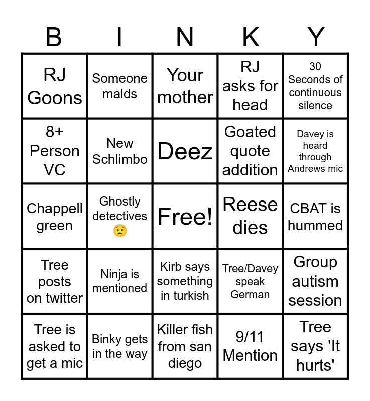 This bingo card has a free space and 44 words: Reese strokes out, Tree says 'It hurts', Turkey is made fun of in some way, Tree is asked to get a mic, Schlimbos life is threatened, 9/11 Mention, Your mother, Tree does something gay, 30 Seconds of continuous silence, Binky gets in the way, RJ asks for head, Reese dies, Kirb says something in turkish, Ninja is mentioned, Kirb/Jim does something stupid, Killer fish from san diego, Tree uses the word 'pookie', Chappell green, Kirb asks for yugioh, Davey is heard through Andrews mic, Someone malds, Soundboard used, Mackenzie abuse, RJ Goons, Niko asks to watch barbie, CBAT is hummed, Penn says something suspect, Tree uses a Viktor gif, Tree/Davey speak German, Tree posts on twitter, Genshin Impact mentioned, Group autism session, Andrew breaks a device, Pillars of fortune, Ghostly detectives 😟, RJ Asks tree to bend over, In sync griddy, Joke repeat 3x, Deez, 8+ Person VC, Goated quote addition, Skibidi brain rot, New Schlimbo and The X that makes you Y.