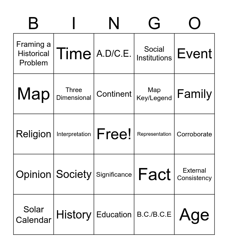 This bingo card has a free space and 45 words: Era, Age, Calendar, Solar Calendar, Lunar Calendar, B.C./B.C.E, A.D/C.E., Evidence, Event, History, Social Institutions, Representation, Significance, Society, Language, Education, Government, Religion, Economy, Family, Time, Space, Turning Points, Framing a Historical Problem, Sourcing, Corroborate, Primary Source, Secondary Source, Fact, Opinion, Internal Consistency, External Consistency, Historical Event, Historical Account, Historian, Interpretation, Place, Perspective/Point of View, Cartographer, Continent, Map, Map Key/Legend, Two dimensional, Three Dimensional and Account.