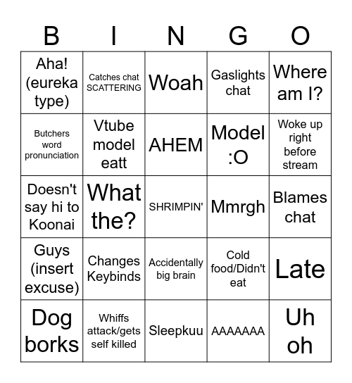 This bingo card has a free space and 24 words: Changes Keybinds, Whiffs attack/gets self killed, AHEM, Dog borks, Where am I?, Aha! (eureka type), Butchers word pronunciation, Catches chat SCATTERING, Mmrgh, Accidentally big brain, Model :O, Doesn't say hi to Koonai, Cold food/Didn't eat, Late, Vtube model eatt, AAAAAAA, Blames chat, Woah, Woke up right before stream, What the?, Uh oh, Guys (insert excuse), Gaslights chat and Sleepkuu.