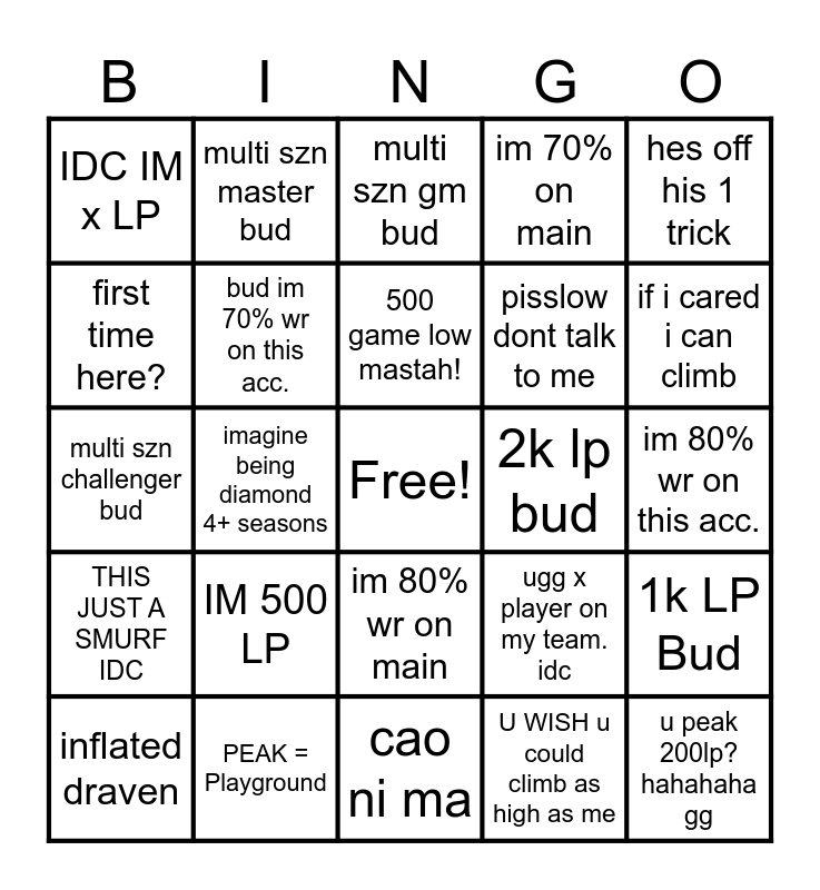 This bingo card has a free space and 24 words: IM 500 LP, PEAK = Playground, 500 game low mastah!, inflated draven, hes off his 1 trick, IDC IM x LP, first time here?, multi szn master bud, 2k lp bud, im 80% wr on main, pisslow dont talk to me, multi szn challenger bud, ugg x player on my team. idc, 1k LP Bud, bud im 70% wr on this acc., U WISH u could climb as high as me, im 80% wr on this acc., multi szn gm bud, if i cared i can climb, imagine being diamond 4+ seasons, u peak 200lp? hahahaha gg, THIS JUST A SMURF IDC, im 70% on main and cao ni ma.