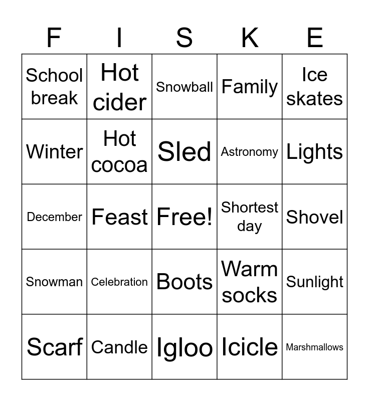 This bingo card has a free space and 34 words: Snowflake, Icicle, Mittens, Hat, Snowman, Hot cocoa, Ice skates, Scarf, Hot cider, Frost, Sled, Snowball, Fireplace, Longest night, Shortest day, Lights, Candle, December, Celebration, Warm socks, Boots, Chilly, School break, Shovel, Igloo, Marshmallows, Family, Friends, Astronomy, Winter, Holidays, Feast, Sunlight and Lantern.
