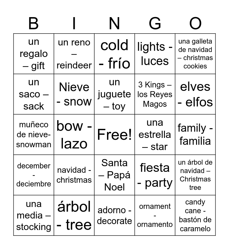 This bingo card has a free space and 24 words: navidad - christmas, árbol - tree, un juguete – toy, una media – stocking, una galleta de navidad – christmas cookies, un regalo – gift, un saco – sack, un reno – reindeer, una estrella – star, Santa – Papá Noel, 3 Kings – los Reyes Magos, muñeco de nieve- snowman, fiesta - party, un árbol de navidad – Christmas tree, Nieve - snow, ornament - ornamento, family - familia, cold - frío, elves - elfos, bow - lazo, candy cane - bastón de caramelo, december - deciembre, lights - luces and adorno - decorate.