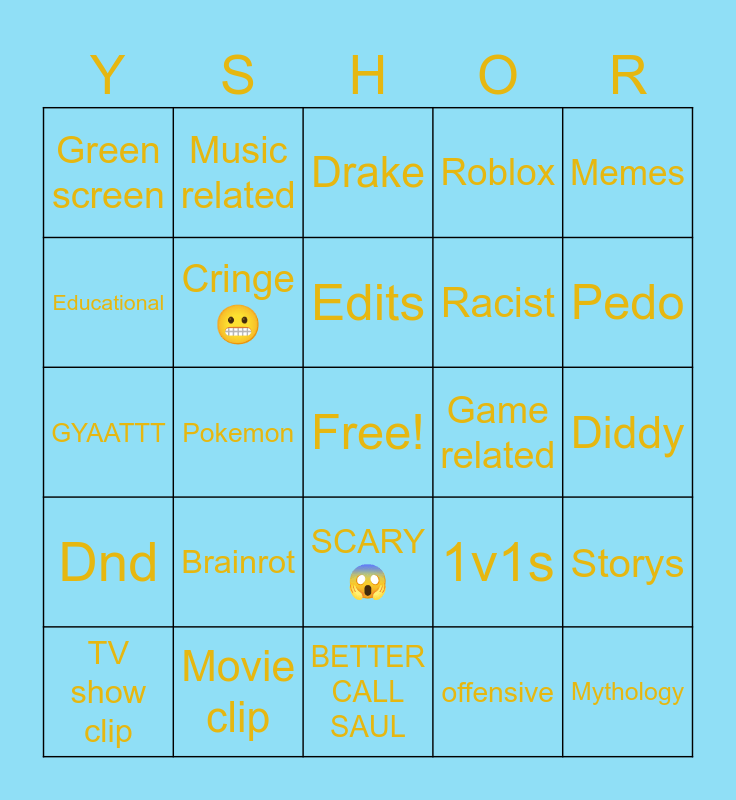 This bingo card has a free space and 24 words: Brainrot, Movie clip, Edits, TV show clip, Memes, Green screen, Educational, Music related, Game related, SCARY 😱, Racist, GYAATTT, 1v1s, Storys, Cringe 😬, offensive, Diddy, Drake, Pedo, Pokemon, Mythology, Dnd, Roblox and BETTER CALL SAUL.