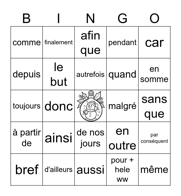 This bingo card has a free space and 25 words: ainsi, aussi, autrefois, bref, car, comme, depuis, finalement, malgré, de nos jours, quand, toujours, en outre, par conséquent, le but, c'est que, sans que, afin que, en somme, donc, même, d'ailleurs, à partir de, pendant and pour + hele ww.