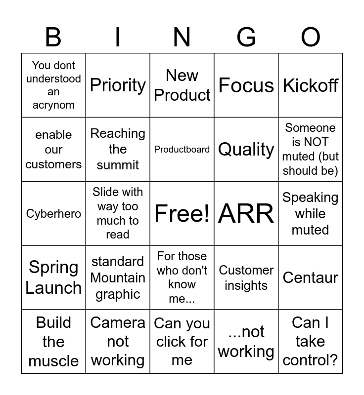 This bingo card has a free space and 29 words: Build the muscle, Sales enablement, Slide with way too much to read, Henning tries a joke, You dont understood an acrynom, New Product, Reaching the summit, standard Mountain graphic, ARR, Camera not working, Speaking while muted, Can I take control?, Can you click for me, ...not working, Someone is NOT muted (but should be), Someone on camera with food, For those who don't know me..., Spring Launch, Kickoff, Cyberhero, Customer insights, Restructure, Quality, enable our customers, Focus, Priority, Centaur, Productboard and Give you ... minutes back.