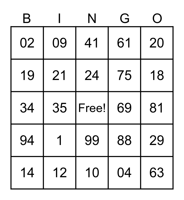 This bingo card has a free space and 25 words: 1, 10, 24, 14, 20, 02, 19, 09, 69, 99, 75, 34, 88, 29, 21, 53, 81, 41, 18, 35, 63, 12, 94, 61 and 04.
