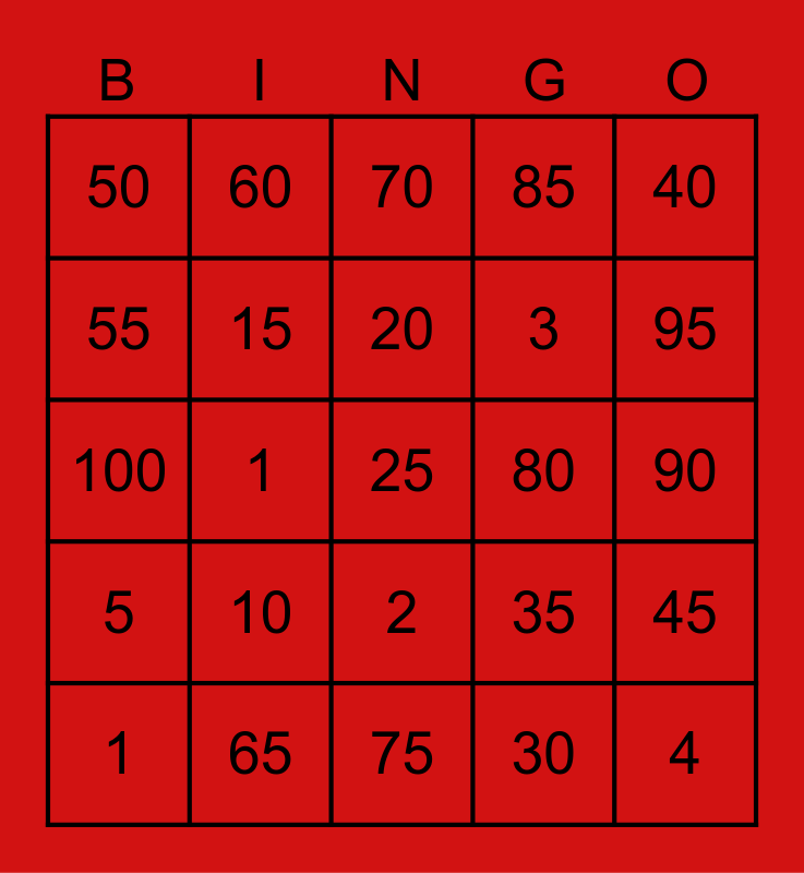 This bingo card has a free space and 24 words: 1, 10, 20, 30, 40, 50, 60, 70, 80, 90, 100, 15, 35, 45, 55, 65, 75, 85, 95, 5, 1, 2, 3 and 4.