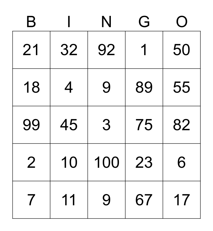 This bingo card has a free space and 24 words: 10, 11, 9, 7, 50, 21, 18, 32, 75, 100, 89, 99, 23, 6, 4, 67, 82, 92, 55, 45, 17, 2, 1 and 9.