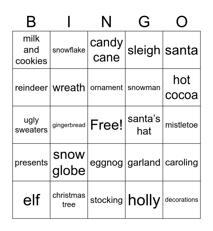 This bingo card has a free space and 24 words: snow globe, christmas tree, ornament, elf, santa, milk and cookies, reindeer, snowflake, santa’s hat, eggnog, snowman, ugly sweaters, garland, caroling, wreath, holly, mistletoe, candy cane, hot cocoa, gingerbread, decorations, presents, sleigh and stocking.