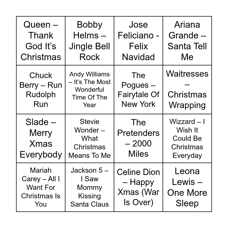 This bingo card has 51 words: Free!, Mariah Carey – All I Want For Christmas Is You, East 17 – Stay Another Day, Wham – Last Christmas, Kelly Clarkson – Underneath The Tree, Shakin’ Stevens – Merry Christmas Everyone, Bobby Helms – Jingle Bell Rock, Brenda Lee – Rockin’ Around The Christmas Tree, Andy Williams – It’s The Most Wonderful Time Of The Year, The Ronettes – Sleigh Ride, The Pogues – Fairytale Of New York, Ariana Grande – Santa Tell Me, Justin Bieber – Under The Mistletoe, Chris Rea – Driving Home For Christmas, Elton John – Step Into Christmas, Band Aid – Do They Know It’s Christmas?, Waitresses – Christmas Wrapping, Jackson 5 – I Saw Mommy Kissing Santa Claus, Eartha Kit – Santa Baby, Chuck Berry – Run Rudolph Run, Wizzard – I Wish It Could Be Christmas Everyday, Burl Ives – A Holly Jolly Christmas, Queen – Thank God It’s Christmas, Slade – Merry Xmas Everybody, Paul McCartney – Simply Having A Wonderful Christmas Time, Jona Lewie – Stop The Cavalry, Stevie Wonder – What Christmas Means To Me, Cliff Richard – Mistletoe & Wine, Boney M. – Mary’s Boy Child, Jose Feliciano - Felix Navidad, Dean Martin – Let It Snow, Michael Bublé – It’s Beginning To Look A Lot Like Christmas, Jackson 5 – Santa Claus Is Coming To Town, Michael Bublé – Walking In A Winter Wonderland, Idina Menzel & Michael Bublé – Baby It’s Cold Outside, Sia – Snowman, The Darkness – Christmas Time (Don’t Let The Bells End), Bing Crosby – White Christmas, Aled Jones – Walking In The Air, MUD – Lonely This Christmas, Celine Dion – Happy Xmas (War Is Over), Leona Lewis – One More Sleep, Frankie Goes To Hollywood – The Power Of Love, Chris De Burgh – A Spaceman Came Travelling, Darlene Love – Christmas (Baby Please Come Home), Gabriella Cilmi – Warm This Winter, The Pretenders – 2000 Miles, John Williams – Somewhere In My Memory, Nat King Cole – The Christmas Song (Merry Christmas To You), Perrie – Christmas Magic and Cliff Richard – Saviour’s Day.